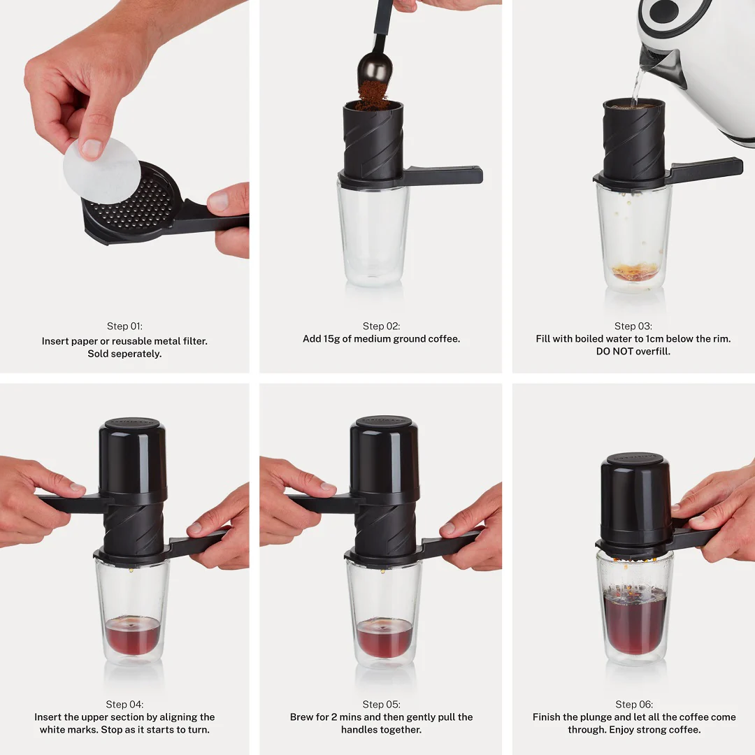 To brew, simply insert a paper or reusable filter, add freshly ground coffee, pour in hot water, twist the top chamber, and press down gently. In less than two minutes, you’ll have a fresh, aromatic cup ready to enjoy. Unlike a French press, the fine filter prevents sediment from reaching your cup, and compared to an AeroPress, it offers a simpler, more compact brewing process.