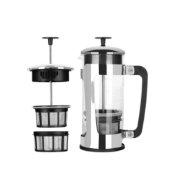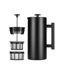 Menšie pressy 300–450 ml sú na 1–2 šálky, univerzál 600–800 ml pripraví 2–3 porcie a 1 l zvládne rodinu či návštevu. Borosilikátové sklo je neutrálne a estetické, nerez prináša odolnosť a často aj dvojstennú izoláciu pre dlhšie teplo. Jemná kovová sieťka necháva v nápoji viac olejov a jemných častíc – typická „press“ textúra.