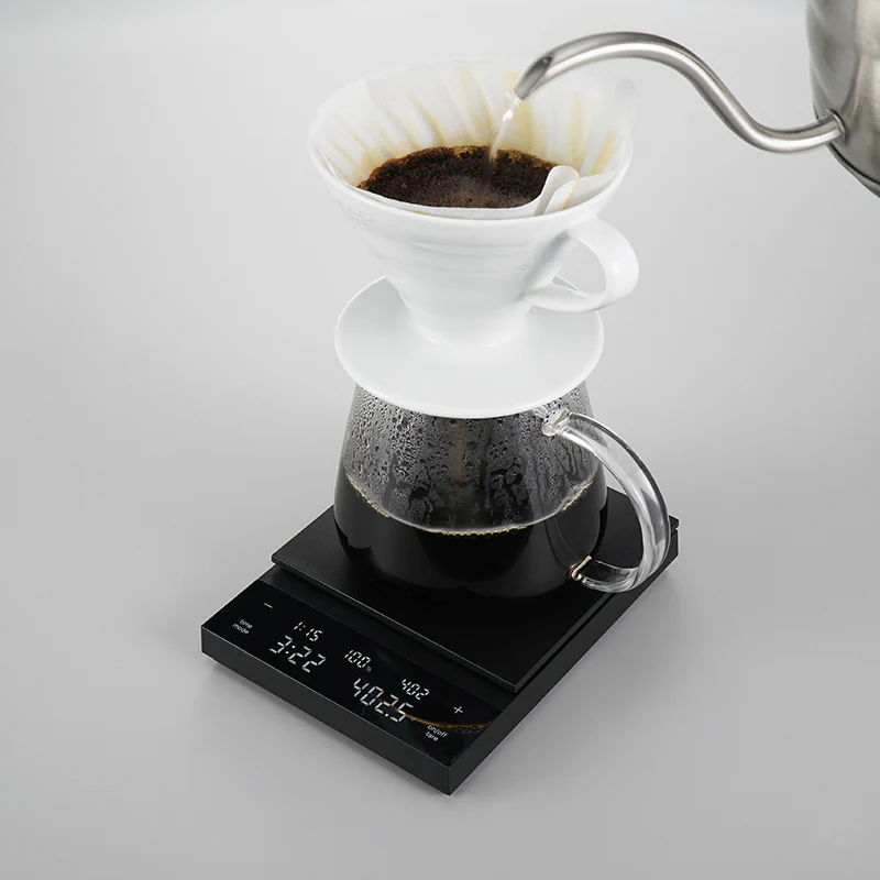 Korpuss ir izgatavots no izturīgiem, karstumizturīgiem materiāliem, kas piemēroti ikdienas darbam kafejnīcās. Pretslīdes virsma uztur stabilu pamatu uzliešanas laikā, savukārt zemais profils ļauj saglabāt dabisku skatpunktu starp serveri un dripperi. Maksimālā jauda līdz 2000 g un jutīga masas reakcija padara svari piemērotus gan vienas tases pour-over, gan lielāku brūvējumu pagatavošanai.