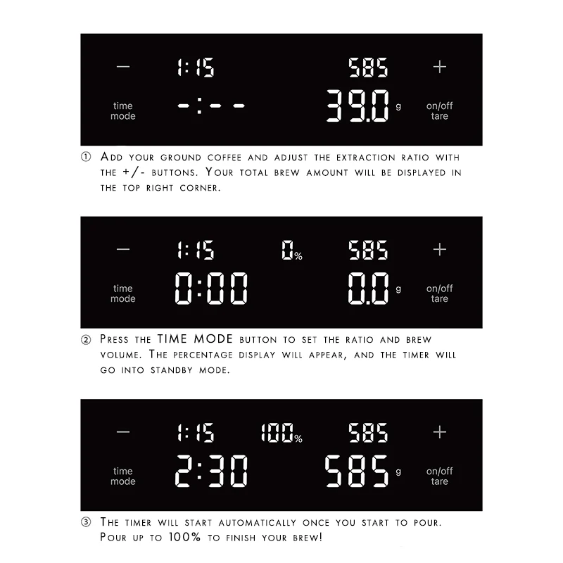 Taimeri var darbināt manuāli vai tas automātiski sāk darboties brīdī, kad ūdens pieskaras kafijai. Tas palīdz uzturēt ritmisku, precīzu uzliešanu, neatkarīgi no tā, vai strādājat mājās vai intensīvā kafejnīcas vidē.