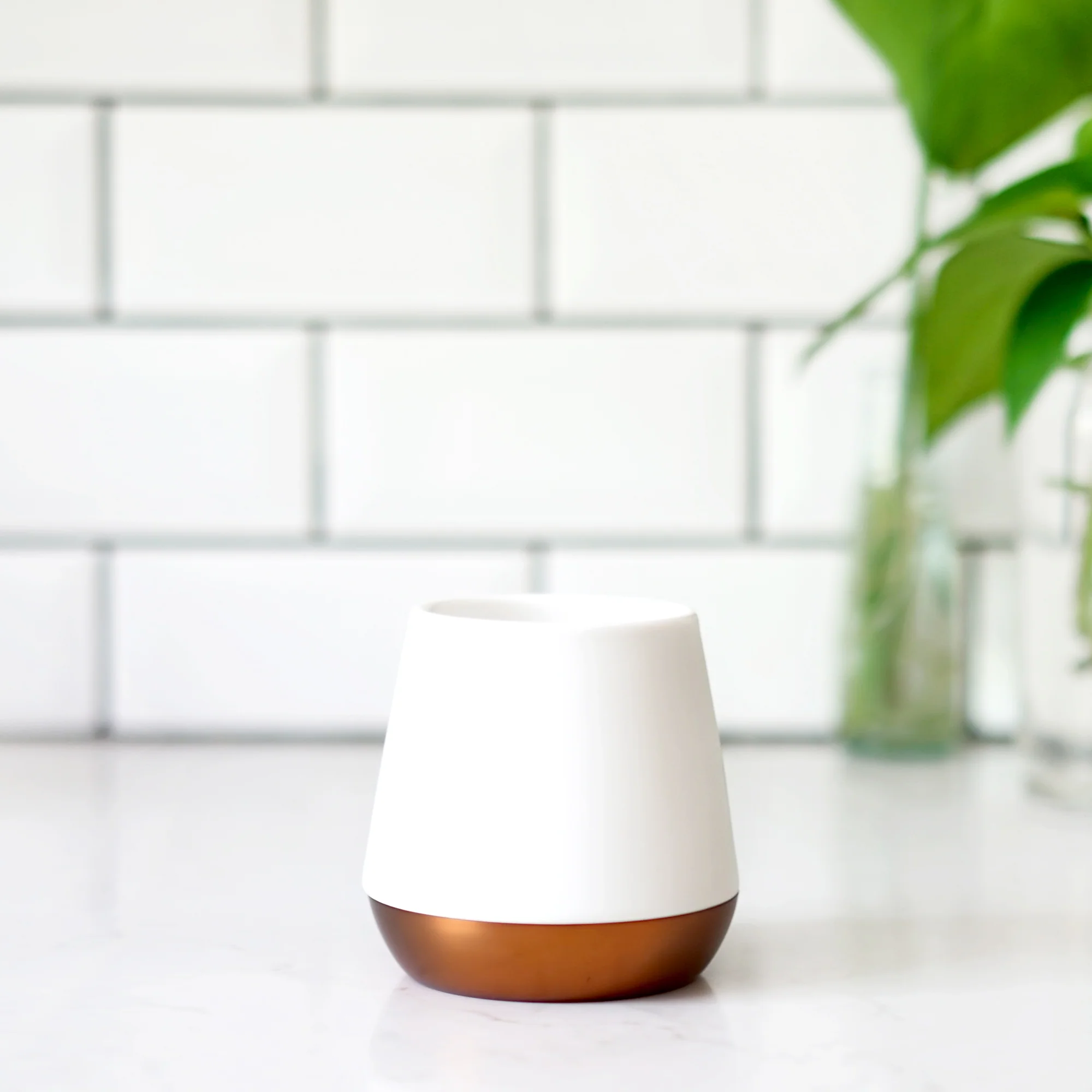 Fellow Joey Double Wall keramický hrnček kombinuje elegantný matný keramický povrch s kontrastným medeným dnom. Dvojstenná konštrukcia udrží nápoj teplý dlho a zároveň zaručí, že vonkajšia stena zostane príjemne chladná bez kondenzácie. Ergonomický kužeľovitý tvar zaručuje pohodlné držanie a nie je vhodný do mikrovlnky ani umývačky.