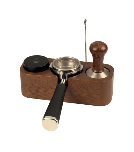Vďaka špeciálnemu tvarovaniu poskytuje miesto na uloženie portafiltra aj tampera, čím udrží pracovný priestor prehľadný a čistý. Drevený povrch je príjemný na dotyk, estetický a dopĺňa profesionálny baristický vzhľad. Podložka zároveň chráni pracovnú dosku pred tlakom a poškriabaním.