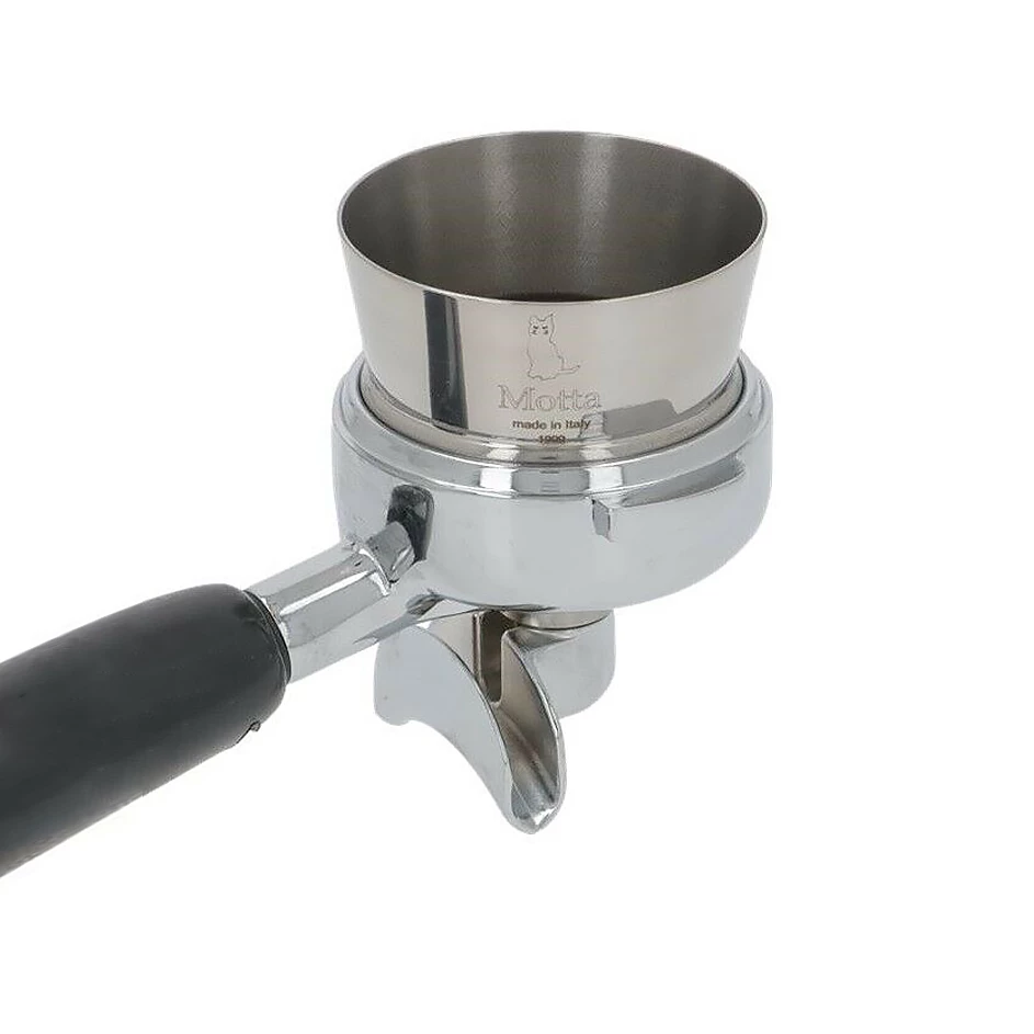 Profesionálny nerezový lievik Motta vyrobený v Taliansku z ocele 18/10. Vhodný pre portafiltere 54–58 mm, eliminuje rozsypanie kávy a zlepšuje presnosť dávkovania.