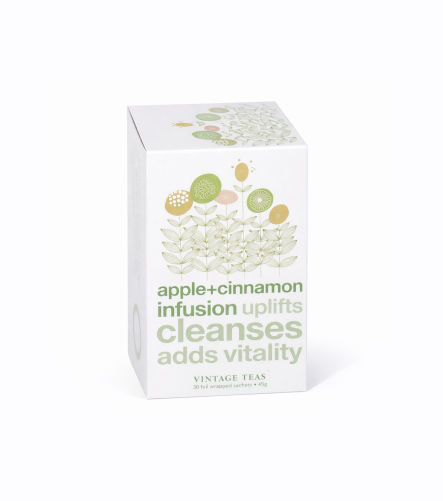 Ceaiul Vintage Teas cu măr și scorțișoară este un ceai din fructe și plante cu un gust reconfortant și delicat dulce. Contribuie la senzația de vitalitate și stare de bine pe parcursul zilei. Ambalajul conține 30 de plicuri de ceai ambalate igienic.