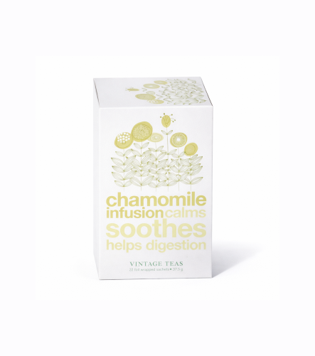 Vintage Teas kamilčni čaj je klasičen zeliščni čaj iz kamilice. Prispeva k občutku sprostitve in podpira dobro počutje čez dan in zvečer. Pakiranje vsebuje 30 higiensko pakiranih čajnih vrečk.