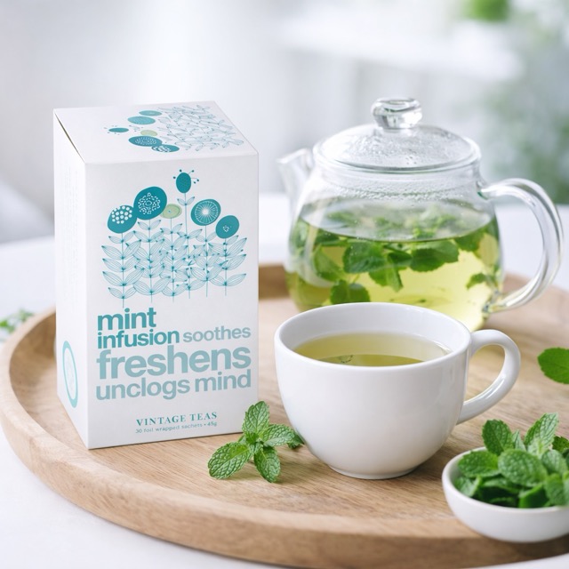 Vintage Teas metin čaj je zeliščni čaj iz 100 % poprove mete z osvežujočim okusom. Prispeva k občutku svežine in duševnega dobrega počutja. Pakiranje vsebuje 30 higiensko pakiranih čajnih vrečk.